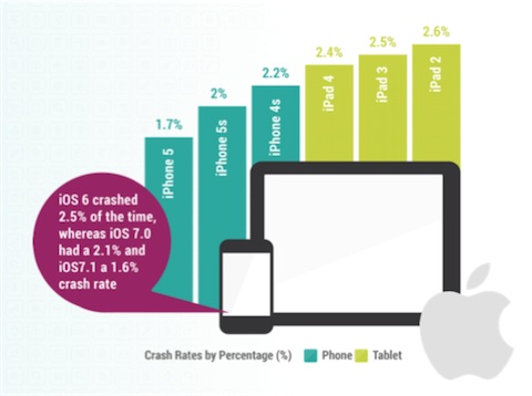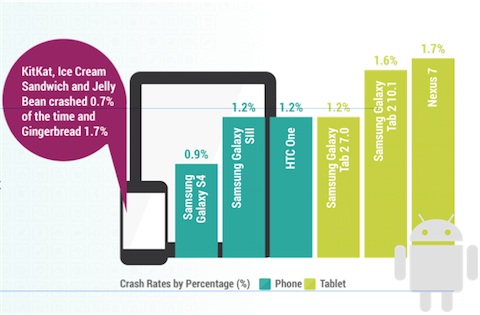 En moyenne, et quelle que soit la plateforme, une application a un taux de plantage de 0.7% sur Android 4.X, contre 1.6% sur iOS 7.1. Un taux en baisse, mais qui était beaucoup plus élevé auparavant pour les deux constructeurs, avec 2.5% pour iOS 6, 2.1% pour iOS et un taux de 1.7% pour Gingerbread.