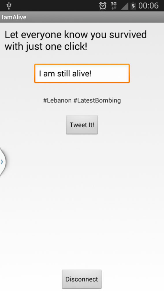 C'est à cause des nombreux attentats qui sévissent au Liban qu'une jeune étudiante libanaise, Sandra Hassan, a décidé de créer une application Android permettant de twitter "I am still alive !", traduit par « Je suis toujours en vie », suivi des hashtags #Lebanon (Liban) et #LatestBombing (Dernière explosion).